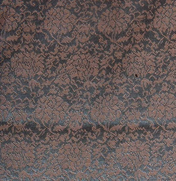 Donsu is a damask weave that originated in China and has been used for centuries for tea ceremony bags, scroll backings etc. Traditionally it would be silk but I get a lot of blends and ones like this that I think is probably rayon. It's a lovely soft dusky blue and pink with a floral (peony?) design. It has a lovely soft drape. It measures 20cm x 2m. I have this on a roll so contact me if you'd like a longer piece. Mid - late 20th century.