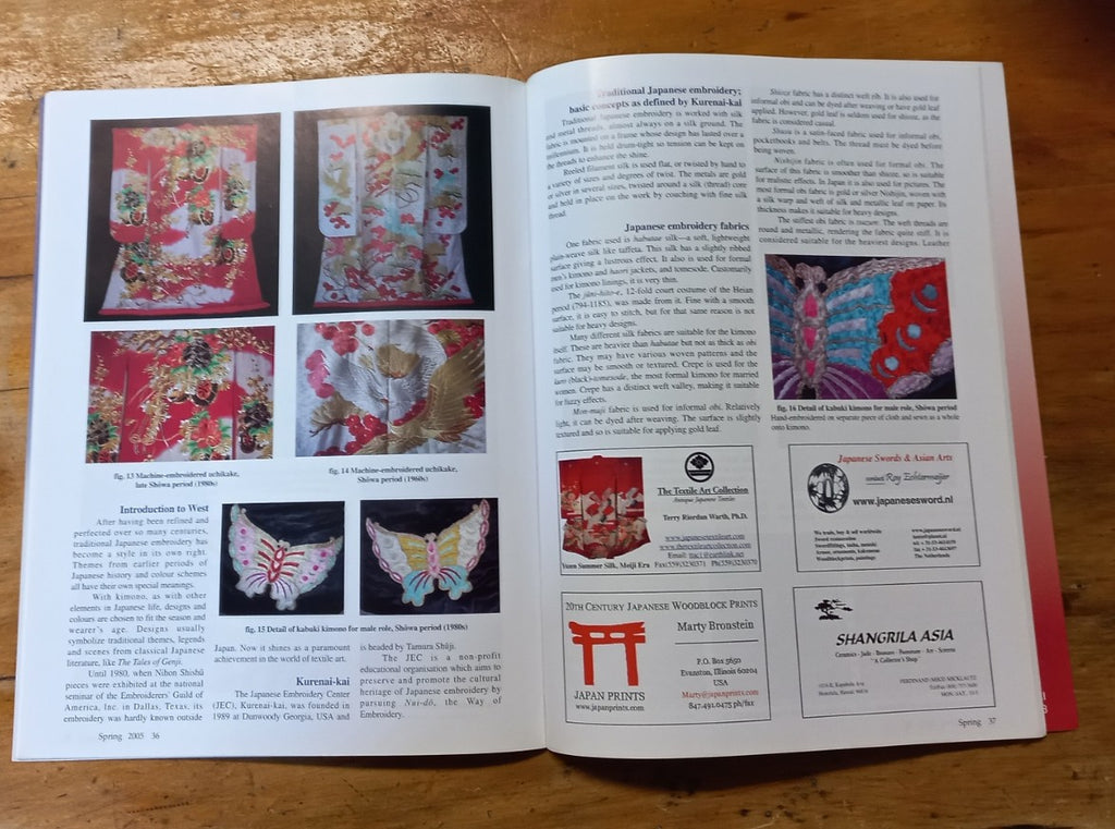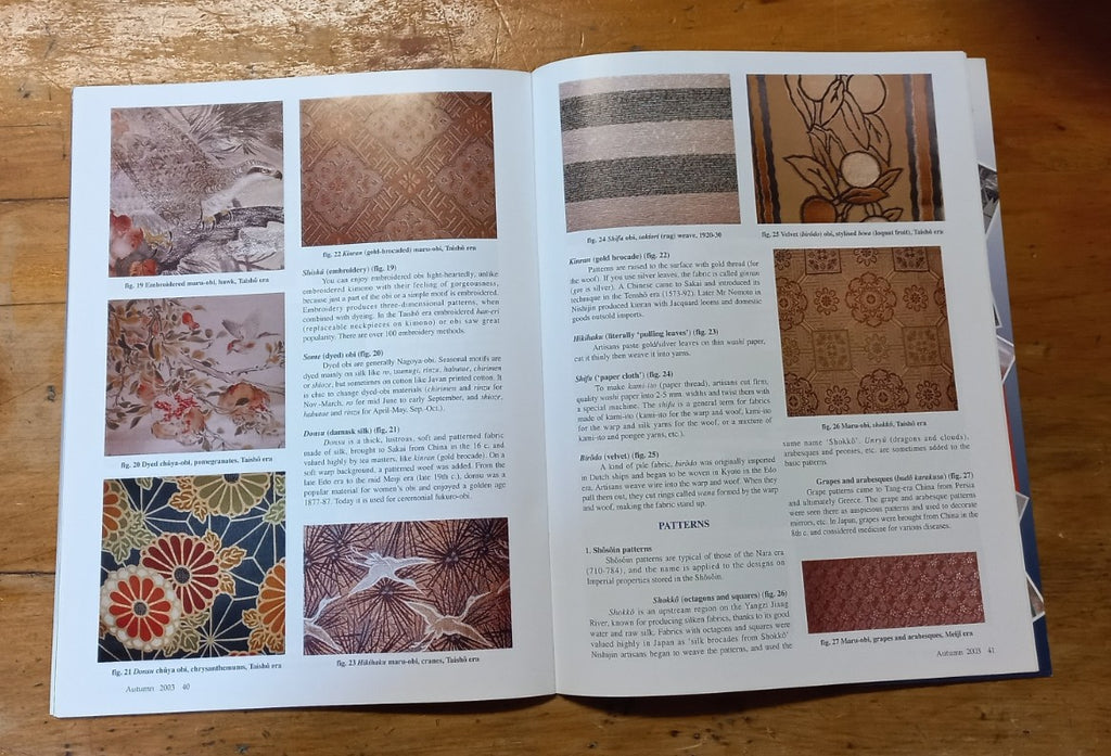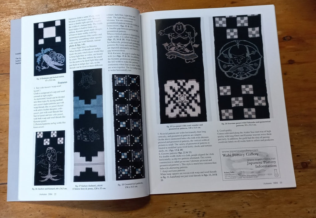 This is a bundle of 16 random issues (Numbers 16, 25 ,32, 40, 42, 44, 46, 49, 51, 52, 53, 55, 56, 59, 62, 63) and covers subjects including iki-ningyo dolls, hagoita, mechanical toys and dolls, netsuke, lanterns, farmhouses, sword fittings, jingasa helmets, cosmetic tools, etc etc. Textiles subjects covered are hand-painted banners, obi, kurume-gasuri, embroidery, uchishiki altar cloths, and ako dantsu rugs. A treat for any Japanophile!