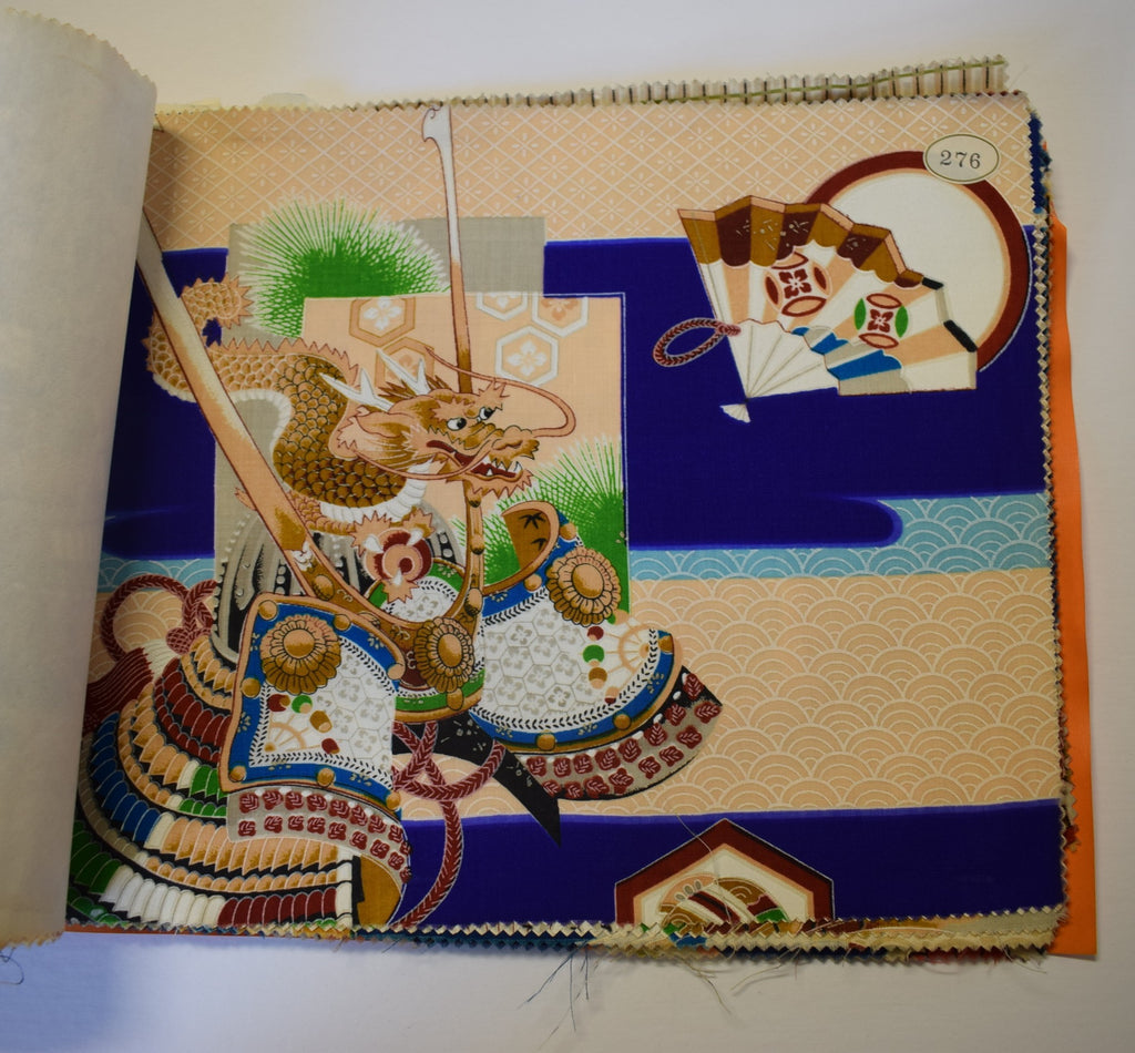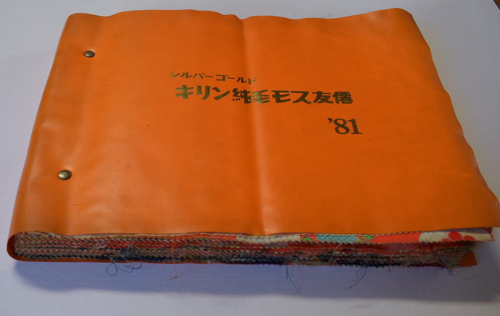 This sample book  is dated 1981 and contains 87 pieces of fine pure wool mosu  ('muslin') samples  for children's  kimono  or possibly juban undergarments (mostly girls' designs). The front cover translates to  'Silver Gold Kirin Pure Wool Mosu Yuzen'.  Pieces are 27cm x 36cm. Japanese mosu is a very fine plain weave wool but not as fine as you might expect from a western cotton muslin.  The use of wool mosu in kimonos was very much in decline by the 1970s so I found the 1981 date a little surprising, but evidence that it was still being produced.  This is lots of fun for lovers of  Japanese kawaii and Showa retro aesthetics!