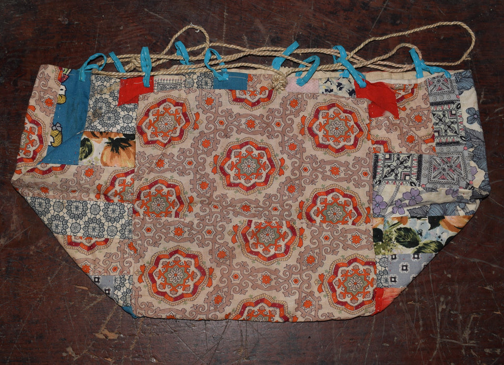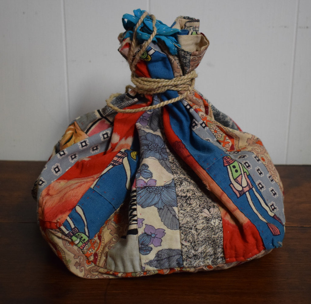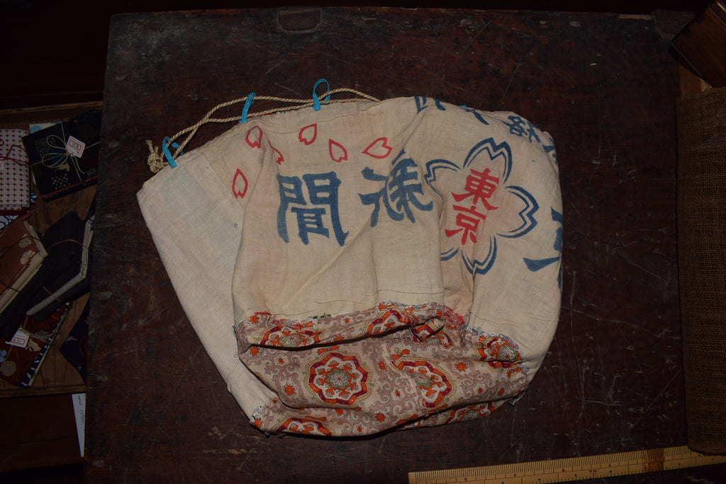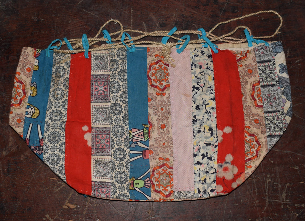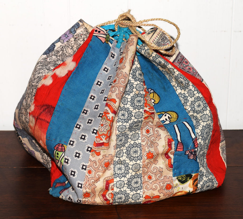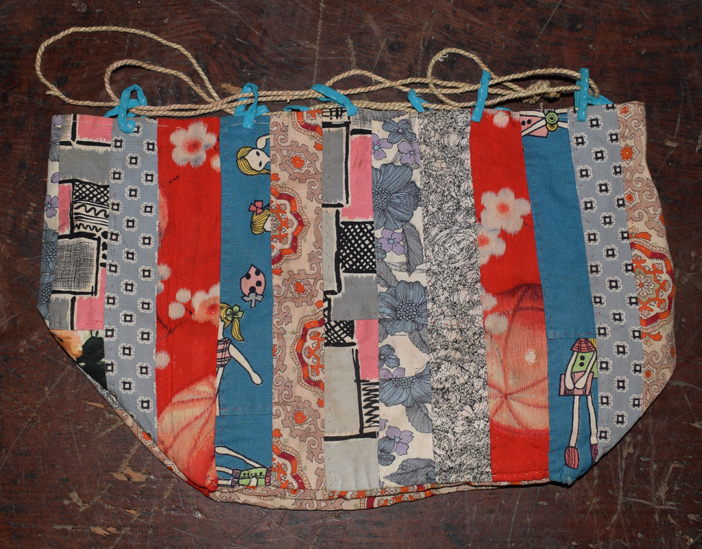 Komebukuro drawstring bags were traditionally used to take offerings of rice or dried beans to temples or shrines . This example is made from remnants of old household textiles which look to be from around the 1960s. The lining is made from an old flour or grain bag. There is one small hole. The loops and string cord are all intact. It is 28 cm high and the base is 26 cm x 26cm.